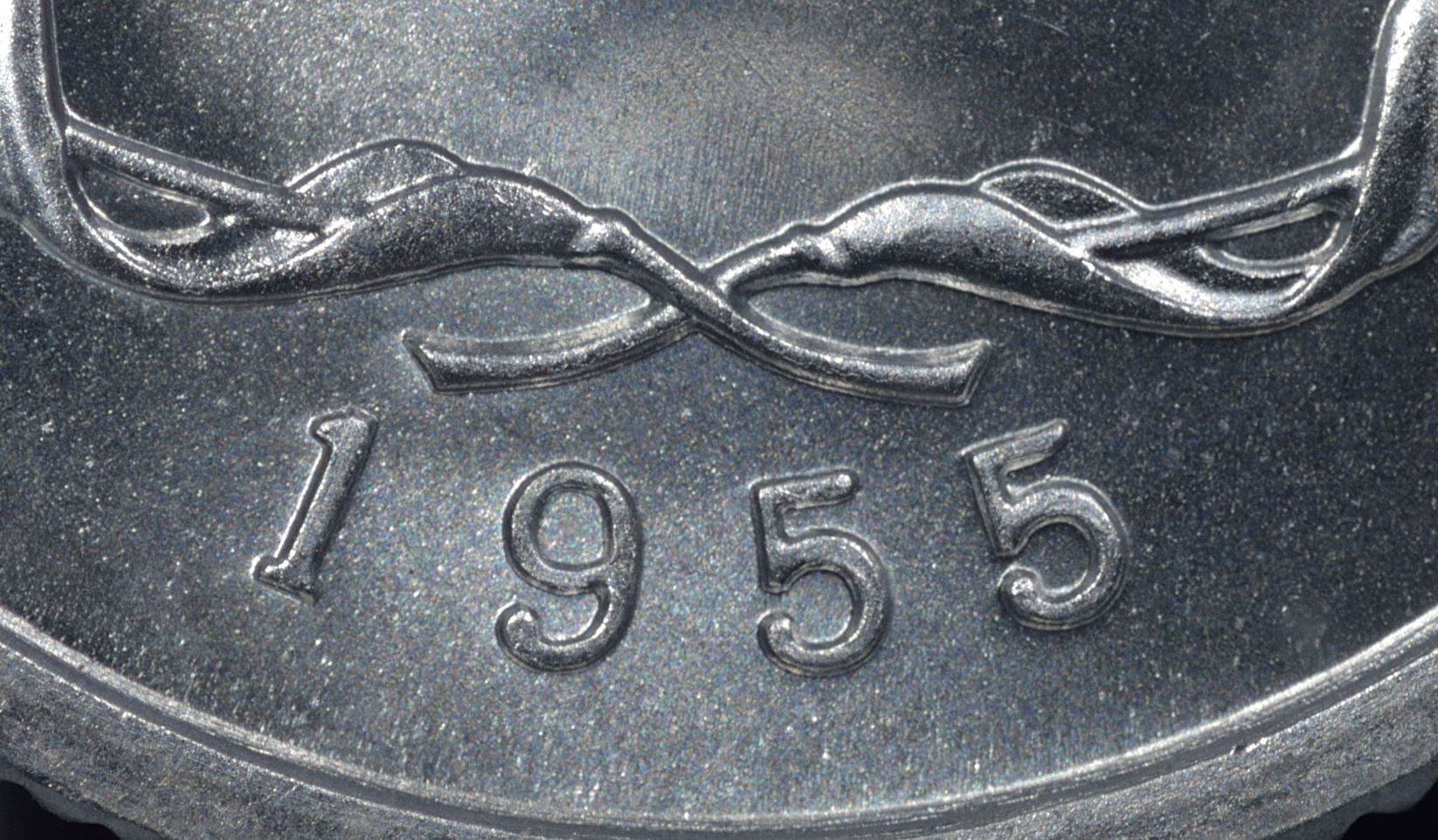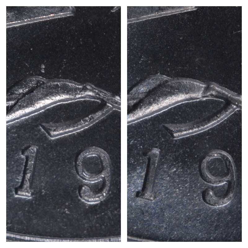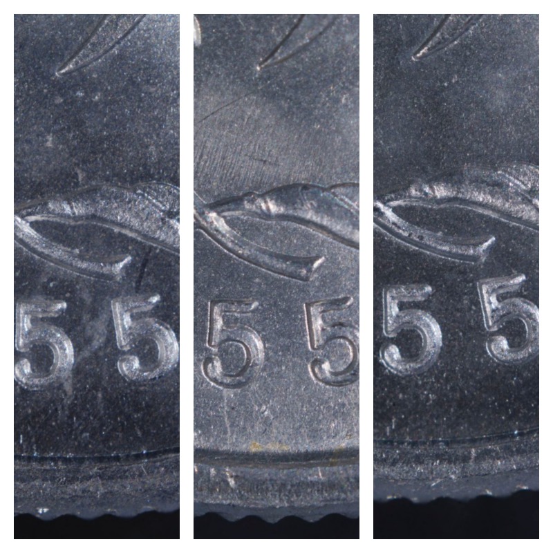 有趣的是,在拍照時候,發現這兩種1955年1分,不僅在表面狀態上有鏡面和非鏡面區分,在年號字體上也有一定的區別。下圖是一組67分兩枚1955年1分的年號大圖,左圖是鏡面狀態,右圖是非鏡面狀態。