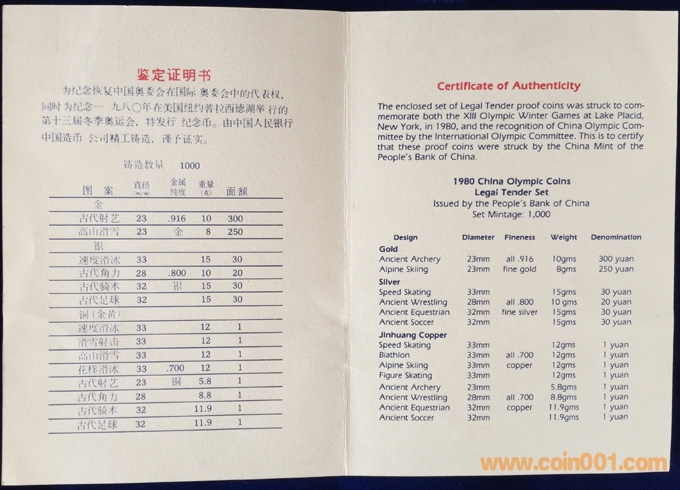 1980年中奧、冬奧套幣