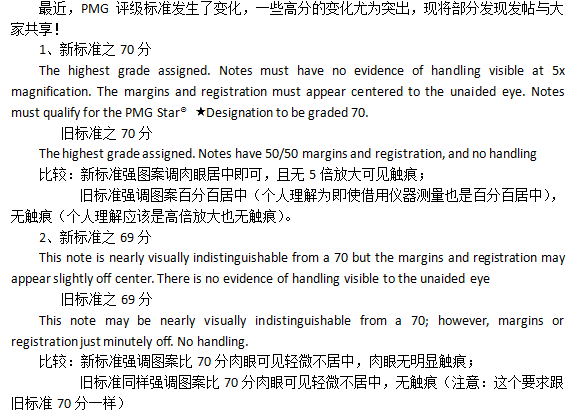 引用 引用第4樓jony于2015-11-22 00:47發表的 : 這是一種合理調整,因為原69分、70分的標準幾乎無法評定,錢幣評級本來就是美學評定為主,不能是刻意去評定造幣機器的性能。 但新標準實施時,應當采取換款識、色標、啟用日期等方式,與舊標評定進行明顯區分,不然造成舊標主定的價值大幅流失,造成一種非正常的管殺不管埋的降值,有損于評級公正公平的承繼性。 .......