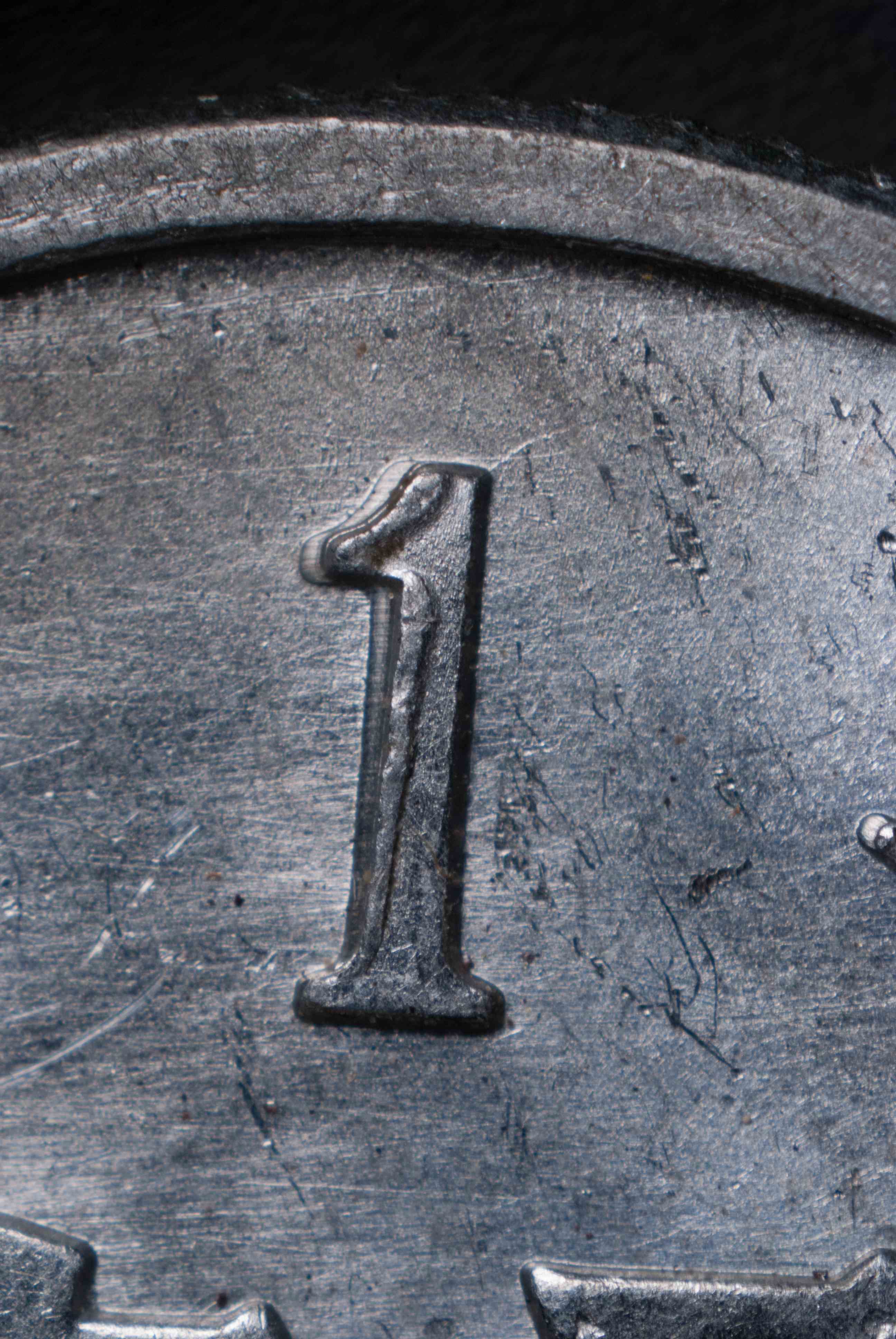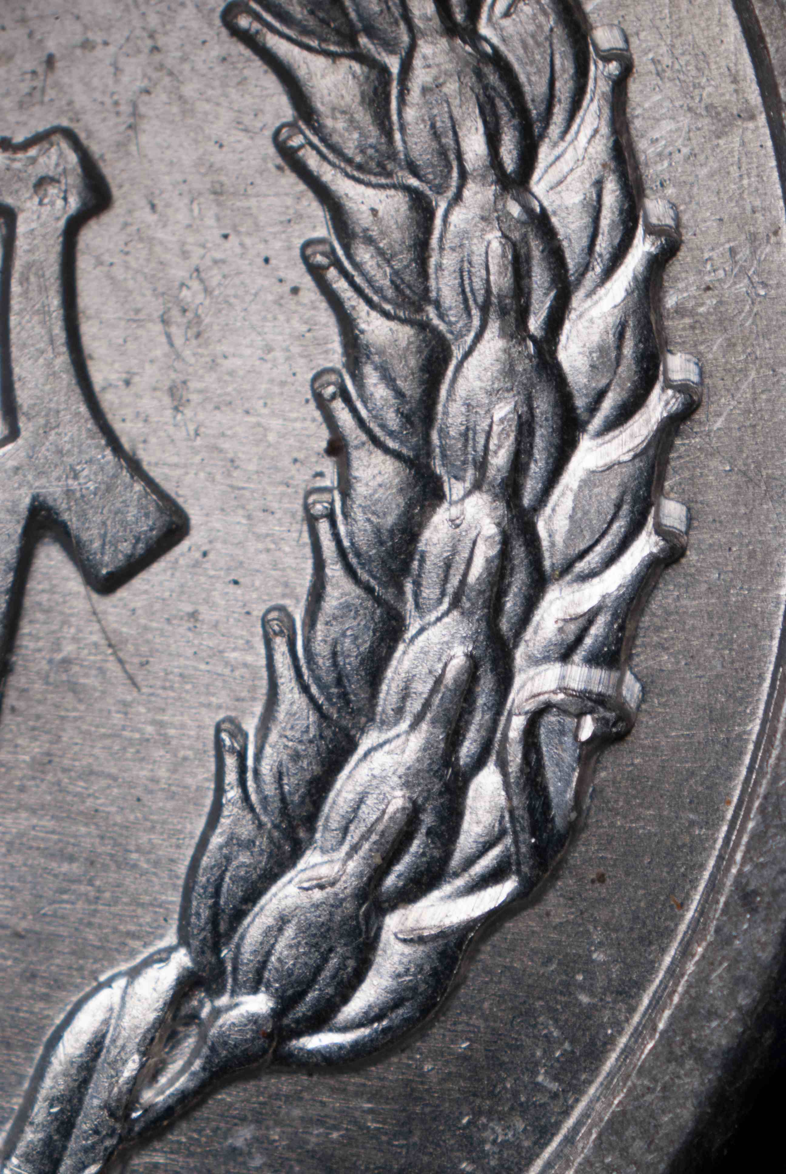 這幅照片顯示了用于壓印林肯分幣背面的二元模。如果您仔細觀察,就會發現二元模表面的圖案是陽紋,和壓印完成的錢幣上的圖案一樣。箭頭所指之處是二元模邊緣的凹槽。如果要多次翻模,工作模上的凸起部分將嵌入這些凹槽,保證二元模和工作模精確對正,在制作的陽模或陰模上做出滿意的圖案。