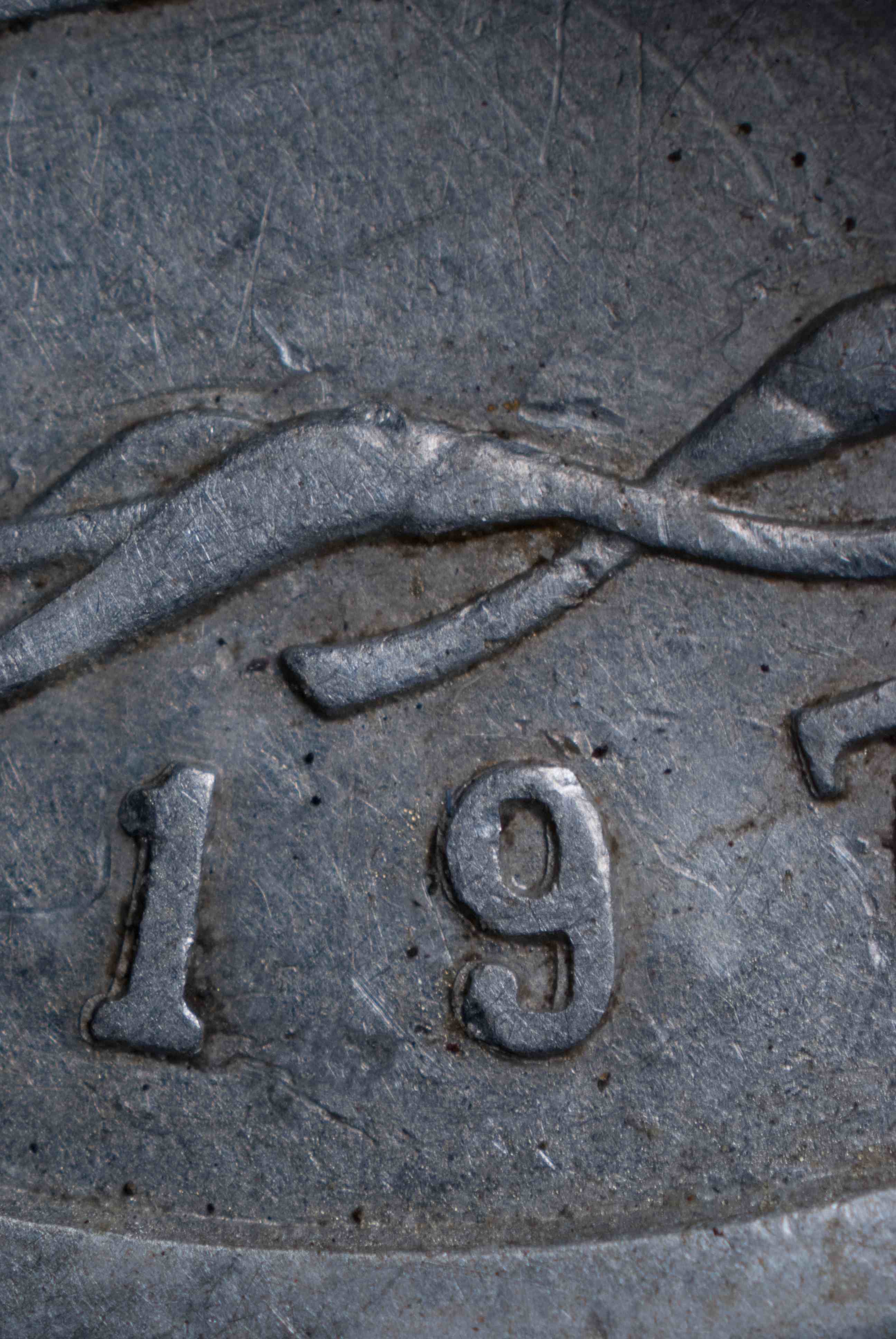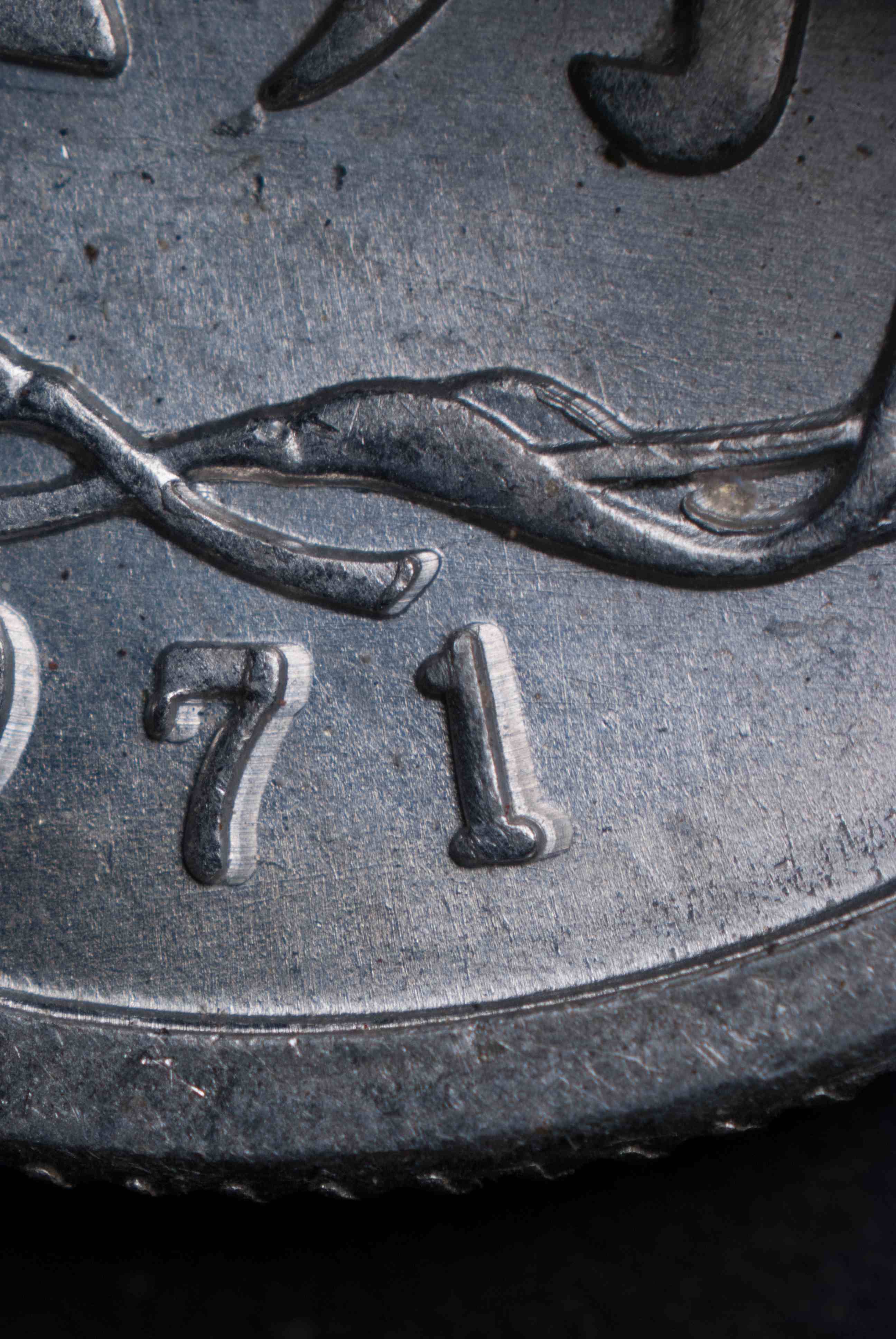 左邊這枚是壓印林肯分幣背面的工作模,已經翻模完畢的外觀。請注意,其上面圖案和壓印出來的幣是相反的。雖然照片上難以看清,但是圖案在工作模上是凹陷的(陰紋)。箭頭所指之處是幣邊周圍的凸出部,它們和二元模上的凹槽相對正。工作模右邊還有一些鋼棒模坯,可用來制作陰紋原模、二元模或工作模。美國造幣局于 1969 年更改了林肯分幣正面的圖案。但是在做出這些更改以后,在工作模上壓出滿意的圖案就非常困難。為了解決這個問題,造幣局去掉了陰模和陽模上的凹凸槽,以便讓陽模更加深入地壓入陰模。但這樣一來,又可能造成重模問題。