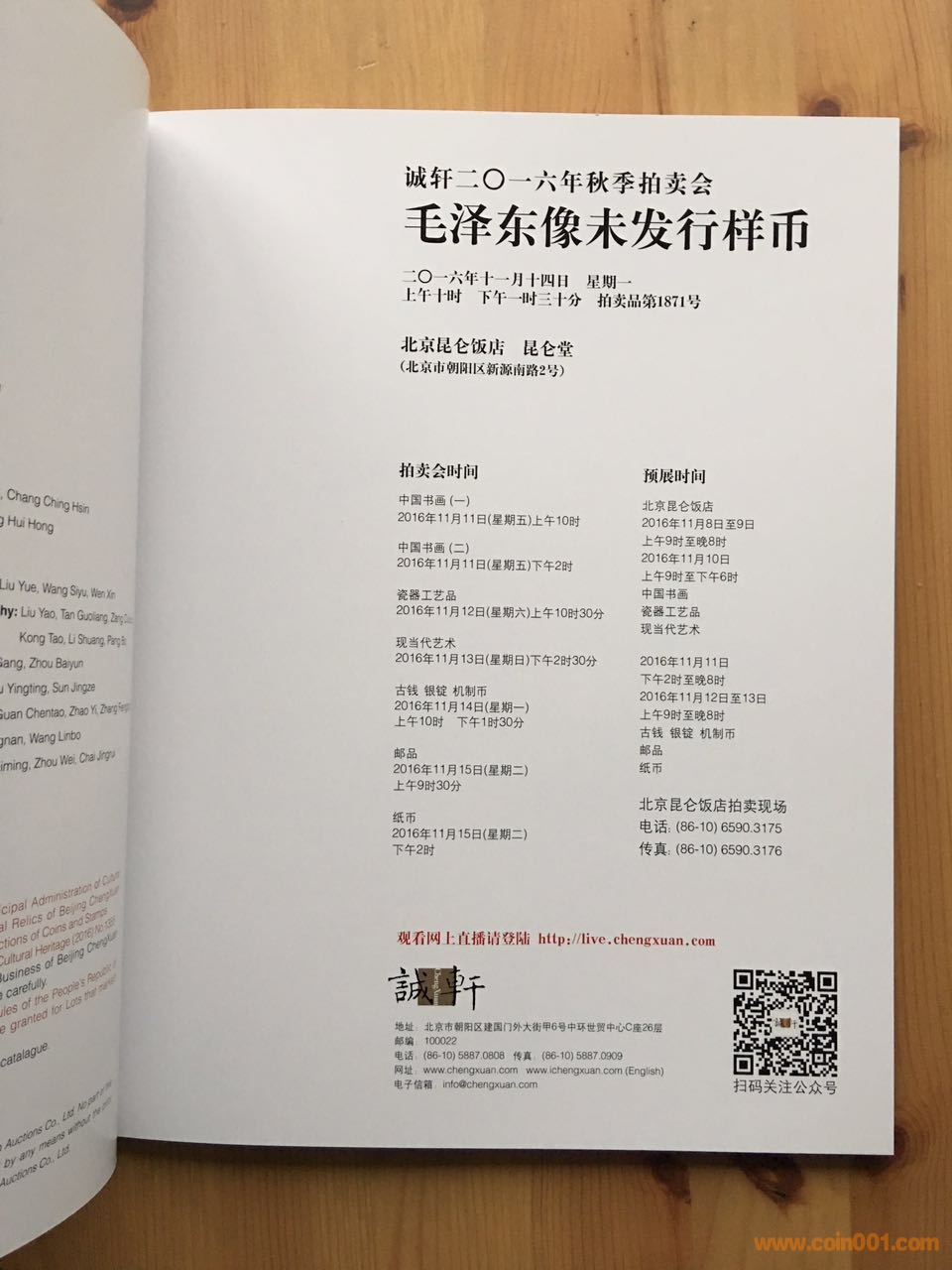 毛澤東像未發行樣幣的拍賣引起業界與社會的廣泛關注,關注的原因一是珍稀,二是拍賣價格預計會創造中國歷朝歷代流通硬幣和流通紙幣的記錄,為了紀念這個記錄的即將誕生,誠軒為此項拍品單獨印制了單行本。