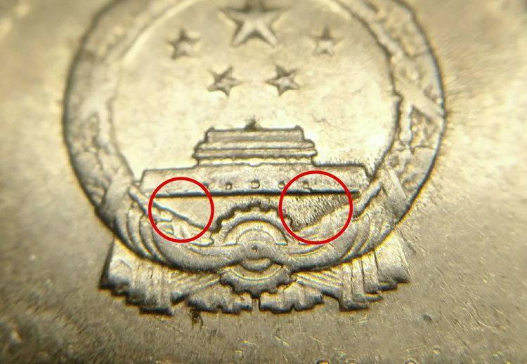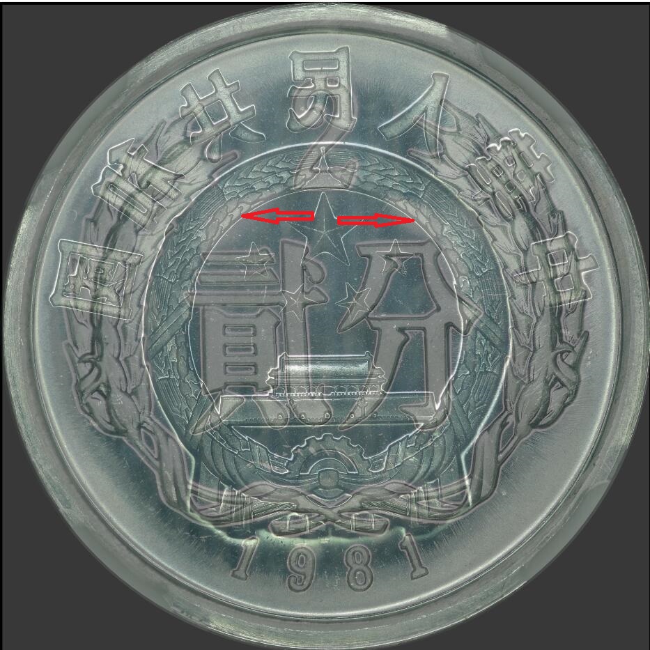 3. “透打部分即描邊內部常常是幣的鏡面效果保留最好的部分,這也更引導我們視覺上區分出透打,分幣和長城角幣整個幣已經出現車輪光的情況下,這個正對著對面國徽的部分還往往保留著鏡面”