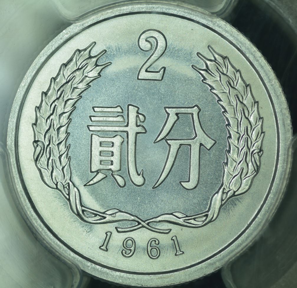也許有人在想,既然這些白霧是鑄紋,那普制幣,甚至是早期普制幣,也該有啊。這想法一點不錯。普制幣上也有這些白霧,只是普制幣的底板本來就糙,這些白霧難得被人注意而已。下面是一枚略帶鏡面的 61 年 2 分,見到 20 年后精制幣上冒出的那些白霧啦?