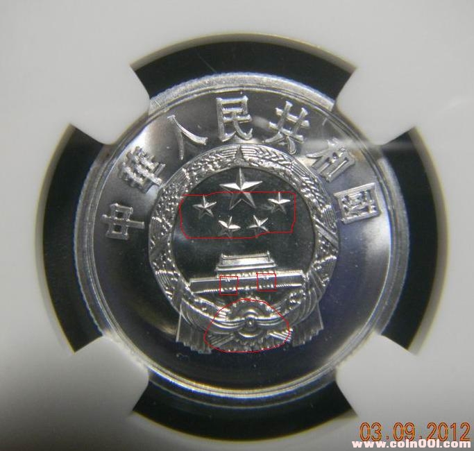 但今天在出售兩枚沈陽版和上海版5分精制幣的時候仔細觀察了一下,發現了一些以前沒有發現的區別。背面不說了,可通過凸版或凹版來加以區分,但從正面來看發現了3個不一樣的地方。