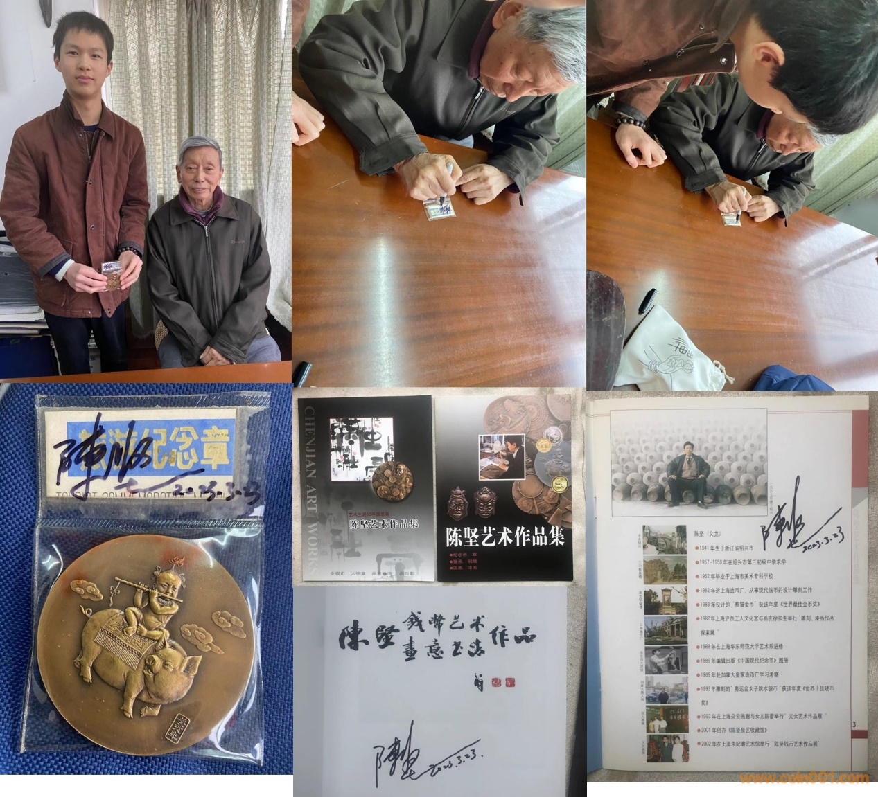 在春拍剛上線時,我就迫不及待的出價了大銅章名品——《小放豬》,然后會員二·,也就是我爸出了價,后來發現小放豬搶的好猛,結拍前幾個小時價格就已經到了28000,但我爸爸直接出到三萬,我由于太激動,又加了一千。拍下后我爸告訴我,如果這枚豬超過三萬他就不要了,買下來是因為他想要帶我去陳堅老師家,請他簽名,還要請陳老師拿著這枚簽名的《小放豬》和我拍一張照片,后來陳堅老師還送了我兩本他簽名的《陳堅作品回憶錄》。枚《小放豬》和這兩本書都是我的終生收藏。