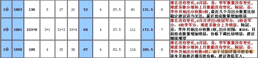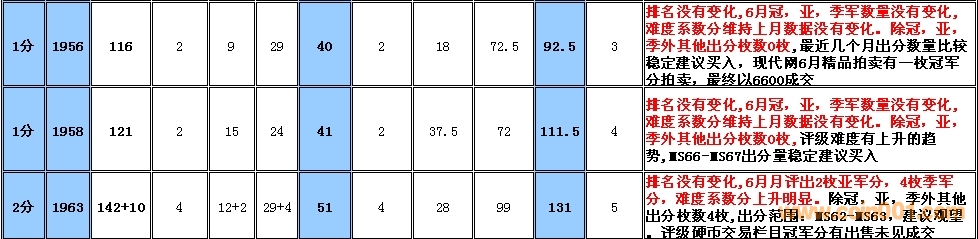 備:這個(gè)采樣的范圍會(huì)有一定的誤差,我將根據(jù)市場(chǎng)和評(píng)級(jí)量的變化每個(gè)季度第一周作出適當(dāng)?shù)恼{(diào)整,難度系數(shù)分在未來(lái)如果超過(guò)1000分將剔除。 1960年2分在一塵有大量貨源出現(xiàn),位置由原來(lái)的第一檔次調(diào)整到第二檔次。難度系數(shù)排序暫時(shí)保留,如分?jǐn)?shù)超過(guò)1000分將刪除,請(qǐng)大家留意!