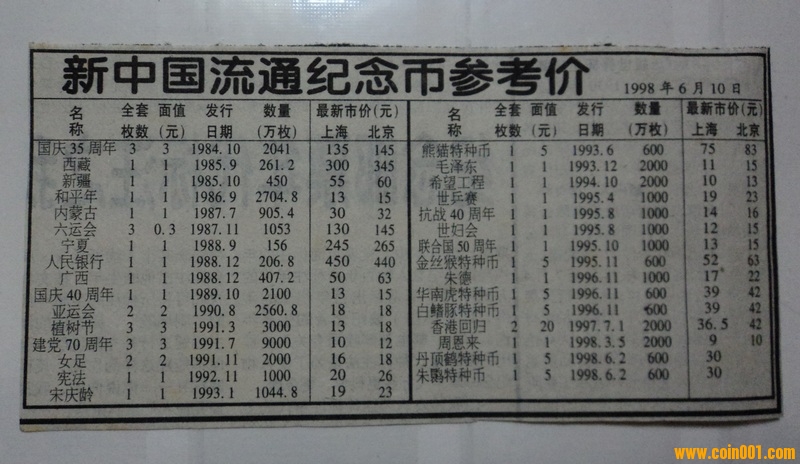 上張十幾年前揚子晚報上紀念幣報價表,只有少數品種進步了,大多數還在原地踏步,這個價格還不太高,97年好像還要高,我買了套卷拆全品建國35和西藏花了900元。