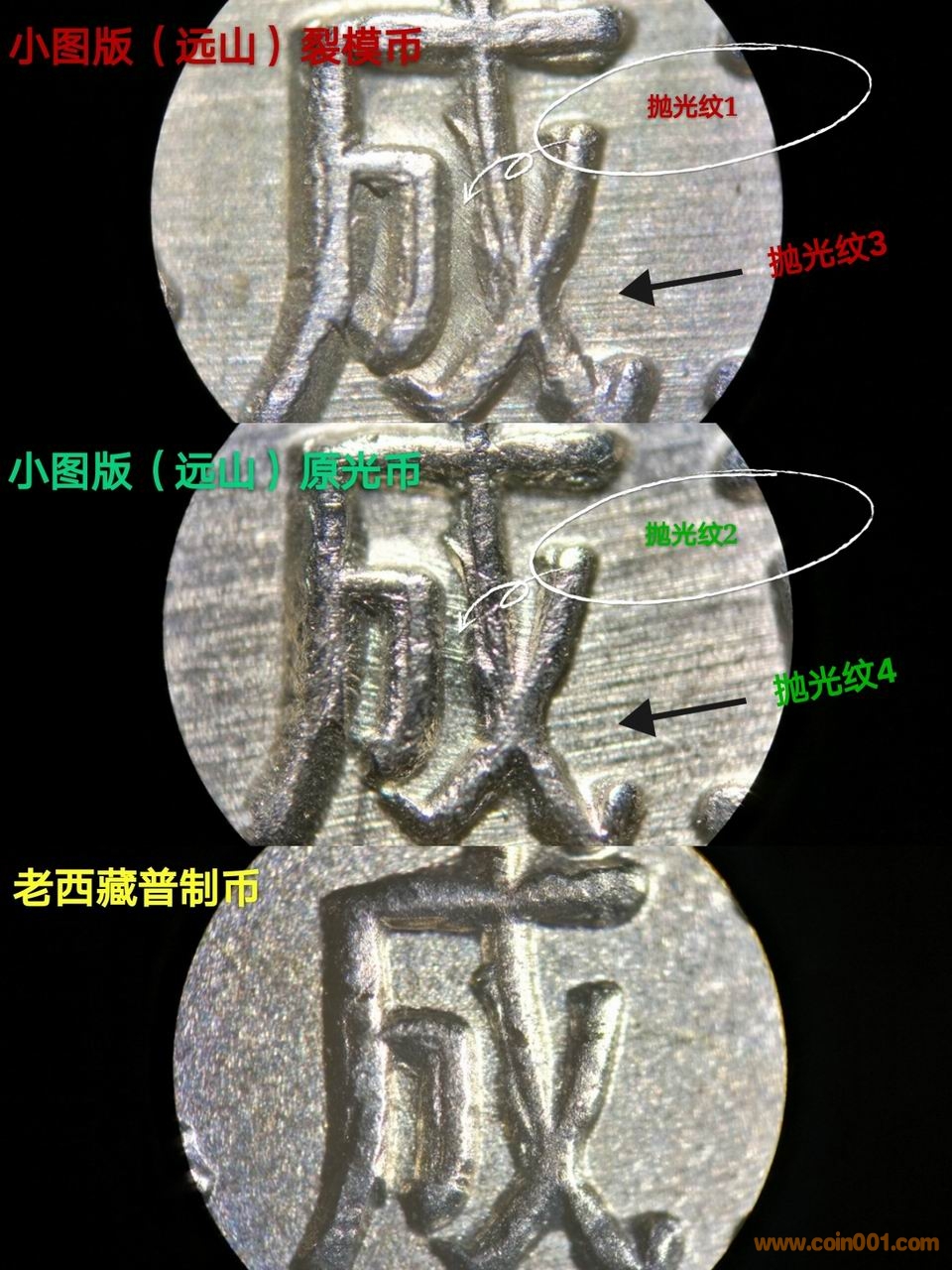 所謂拋光痕 1、2壓著拋光痕 3、4 完全是因為它們不在一個平面上而造成的錯覺。底板上的拋光痕在幣面凸出的部分會斷掉。碰巧這個凸出部分又有自己的拋光痕而已。這無法用作組合模具的證據。