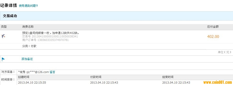 引用 引用第60樓zhanglf1981于2013-04-10 22:11發表的 : 預定1盎司純銀章一枚,加申通12塊共402塊十分鐘之內轉多多支付寶。