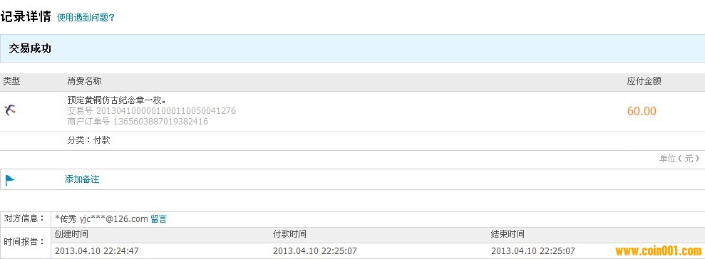 引用 引用第67樓zhanglf1981于2013-04-10 22:23發表的 : 再預定黃銅仿古紀念章一枚,一起發貨即可,60塊十分鐘之內轉多多支付寶。