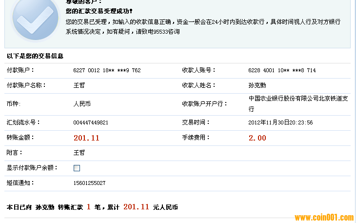 付款方 賬號(hào) 622846002000XXXXXX12 收款方 賬號(hào) 6228490010015268714