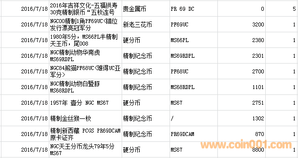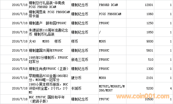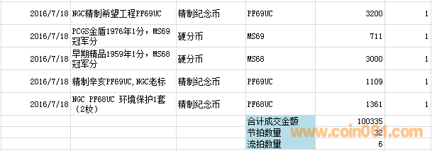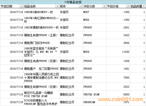 ?? 現(xiàn)代錢幣網(wǎng)7月精品拍賣在2016-7-18晚上21:00正式開始,拍品主要涵蓋精制紀(jì)念幣、硬分幣、樣幣、新老三花幣、長(zhǎng)城幣、貴金屬幣6個(gè)板塊,本次精品拍賣一個(gè)有38項(xiàng)拍品上拍,最終成交32項(xiàng),成交率84%,成交總金額100355元成交。 7月進(jìn)入了收藏市場(chǎng)傳統(tǒng)的歇夏期,但是精品拍賣的熱情依舊不減,上拍數(shù)量出現(xiàn)了遞增,成交率依舊維持在較高的水平。