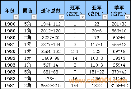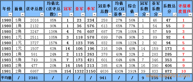 普制長城幣評級難度排序與早期分幣難度排序有明顯的區別,為了能體現難度系數的準確性和科學性在計算時考慮的因素相對要復雜一些,主要參考了評級的總數,均值比(送評總數),冠亞季軍總數,均值比(冠亞季總數)等數據作為計算的主要依據,同時各個均值段的補償方法也比較復雜 首先我們需要討論評級幣的價格構成 評級幣的價格構成 裸幣的價格+評級溢價+評級費用=評級幣的參考價格 主要可以參考以下2個因數, 第一個因素為裸幣本生的價格(它的價格變動主要依據裸幣成交價格的變動而變動與評級溢價之間的關系不大) 舉例來說: 裸幣的價格上漲1倍評級難度系數沒有變化的話,評級幣的價格應該相應的上漲1倍+溢價+評級費用=評級幣的參考價格,裸幣的價格的上漲只能帶動評級幣裸幣部分的上升,裸幣價格下跌,評級難度系數沒有變化的話,評級幣的價格為裸幣下跌的價格+溢價+評級費用=評級幣的參考價格,裸幣的價格的下跌只能帶動評級幣裸幣部分的下跌 第二個因素為評級難度所產生的一個溢價 難度系數越高它對應的溢價就越高。溢價變化主要依據評級難度系數與系數平均值的變化和對比來決定,溢價水平的上升在一定的程度上會提升高品質裸幣的價格(卷光卷拆的硬幣)和品相的稀缺性,裸幣價格的下跌,如果評級難度提高的話評級幣的價格反而有可能會上升,從以上的結果可以得出下列結論,溢價是評級價格體系當中最重要的組成部分,溢價和裸幣的價格體系完全是獨立的,之間的價格沒有直接的聯系 備注:關于這個數據的準確性在設計這個表的時候我已經考慮到了一個重評的可能性所以我只取冠,亞,季軍作為一個參考并同時設計了一個補償方案,重評從時間和金錢的角度來衡量的話不是非常經濟且還存在一定的風險,但是從長遠看不能排除這個因數。雖然將來會產生一些誤差,但我認為誤差不會太大尤其在高分段和稀缺性的錢幣,對于普制長城幣來說NGC已經作為收藏的主流其數據的準確性還是比較值得信賴的。 采樣的范圍 取樣范圍:1980-1985 普制長城幣 難度排序的選擇標準:送評總數的平均值高于100%的普制長城幣,低于100%的數據將不體現在難度排序中 計算公式: 評級總數/均值=均值比 考慮到1983年長城幣存世量明顯低于其他年份的普制長城幣,1983年的數據將保留和計入到難度排序中,大家可以通過下面的圖表黃色部分發現被刪除的年份主要是送評溢價不高的年份,如果未來送評量穩步上升的話,它將加入到采樣的范圍. 備:這個采樣的范圍會有一定的誤差,我將根據均值比的變化每個季度第一周進行適當的調整,由于普制長城幣的版別比較復雜,無法進行細分這里主要以年份為主,請大家諒解! 采樣的數據和計算的依據 統計第一檔次每個年份冠,亞,季的出分數量作為一個分析依據,為了能更加的量化我用數字的方法進行統計,方法如下: 調整后的均值比 普制長城幣的計算方法如下: 綜合值的計算方法: (送評總數均值比+冠亞季總數均值比)÷2=綜合值 具體計算方法如下: 均值比在0-50% 冠軍分1枚為1分2枚2分以此類推,亞軍分1枚為2分2枚4分以此類推,季軍1枚為3分2枚6分以此類推 補償方法如下: 如果冠軍分的評分數量大于總數(冠,亞,季之和)的15%,冠軍分的1枚為1.5分,如果冠軍分的評分數量大于總數(冠,亞,季之和)的50%冠軍分的1枚為2分 如果亞軍分的評分數量大于總數(冠,亞,季之和)的35%,亞軍分的1枚為2.5分,如果亞軍分的評分數量低于總數(冠,亞,季之和)的25%亞軍分的1枚為1.5分 均值比在50-100% 冠軍分1枚為1分2枚2分以此類推,亞軍分1枚為1.5分2枚3分以此類推,季軍1枚為2分2枚4分以此類推 此范圍+值補償 如果冠軍分的評分數量大于總數(冠,亞,季之和)的50%冠軍分的1枚為1.25分 如果亞軍分的評分數量大于總數(冠,亞,季之和)的35%,亞軍分的1枚為1.75分 均值比在100-150% 冠軍分1枚為0.5分2枚1分以此類推,亞軍分1枚為1分2枚2分以此類推,季軍1枚為1.5分2枚3分以此類推 補償方法如下: 如果冠軍分的評分數量大于總數(冠,亞,季之和)的15%,冠軍分的1枚為0.75分,如果冠軍分的評分數量大于總數(冠,亞,季之和)的50%冠軍分的1枚為1分 如果亞軍分的評分數量大于總數(冠,亞,季之和)的35%,亞軍分的1枚為1.25分,如果亞軍分的評分數量低于總數(冠,亞,季之和)的25%亞軍分的1枚為0.75分 均值比在150%-180% 冠軍分1枚為0.5分2枚1分以此類推,亞軍分1枚為0.75分2枚1.5分以此類推,季軍1枚為1.25分2枚2.5分以此類推 如果冠軍分的評分數量大于總數(冠,亞,季之和)的15%,冠軍分的1枚為0.62分,如果冠軍分的評分數量大于總數(冠,亞,季之和)的50%冠軍分的1枚為0.75分 如果亞軍分的評分數量大于總數(冠,亞,季之和)的35%,亞軍分的1枚為1分,如果亞軍分的評分數量低于總數(冠,亞,季之和)的25%亞軍分的1枚為0.5分 均值比在180%以上 冠軍分1枚為0.25分2枚0.5分以此類推,亞軍分1枚為0.5分2枚1分以此類推,季軍1枚為0.75分2枚1.5分以此類推 此范圍+值補償 如果冠軍分的評分數量大于總數(冠,亞,季之和)的50%冠軍分的1枚為0.375分 如果亞軍分的評分數量大于總數(冠,亞,季之和)的35%,亞軍分的1枚為0.625分 大家可以根據上面的計算方式得出一個結論,難度的高低除了以高分的數量作為一個衡量的標準外評級總量也是一個不可忽視的因數,通常難度是必須通過數據之間的對比,評級總數,冠亞季軍總數是一個非常重要的參考指標 