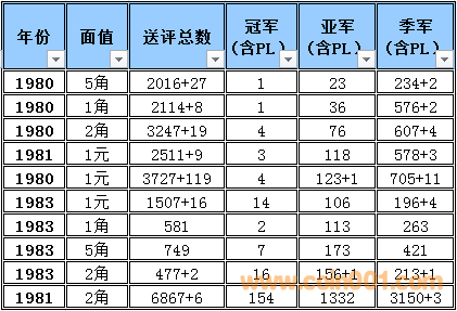 備注:關于這個數據的準確性在設計這個表的時候我已經考慮到了一個重評的可能性所以我只取冠,亞,季軍作為一個參考并同時設計了一個補償方案,重評從時間和金錢的角度來衡量的話不是非常經濟且還存在一定的風險,但是從長遠看不能排除這個因數。雖然將來會產生一些誤差,但我認為誤差不會太大尤其在高分段和稀缺性的錢幣,對于普制長城幣來說NGC已經作為收藏的主流其數據的準確性還是比較值得信賴的。