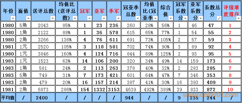 普制長城幣評級難度排序與早期分幣難度排序有明顯的區別,為了能體現難度系數的準確性和科學性在計算時考慮的因素相對要復雜一些,主要參考了評級的總數,均值比(送評總數),冠亞季軍總數,均值比(冠亞季總數)等數據作為計算的主要依據,同時各個均值段的補償方法也比較復雜