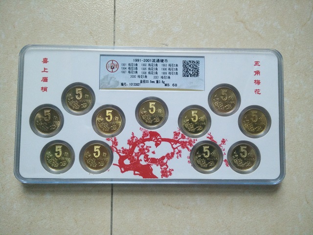 梅花5角硬幣材質為銅鋅合金,顏色金黃,設計、制作精良,美觀大方,俗稱“梅花5角硬幣”。梅花5角硬幣為第四套人民幣輔幣,分別為年號1991、1992、1993、1994、1995、1996、1997、1998、1999、2000、2001共11種,從1991-2001每年號都有發行。梅花5角硬幣年份不同收藏價值大相徑庭。其中,93年的梅花5角硬幣發行量最少,收藏價值最大。其次是94年、91年、96年、92年、98年、95年、97年、99年、2000年和2001年。梅花5角硬幣自1992年投放市場參與流通,至今已20多年。從1991到2001年,每年都有發行,共11枚,且發行量很大。集全成套,本非難事。隨著第四套流通硬幣的大量發行流通,第三套流通硬幣正在逐步退出流通領域,特別是5角梅花幣流通量明顯減少,有些品種如1993和1994年梅花5角硬幣甚難見其尊容。梅花5角硬幣是以中華人民共和國命名的最后一枚硬幣,此后的硬幣則改印為中國人民銀行,這種獨特的歷史意義更使得收藏愛好者為之癡迷。