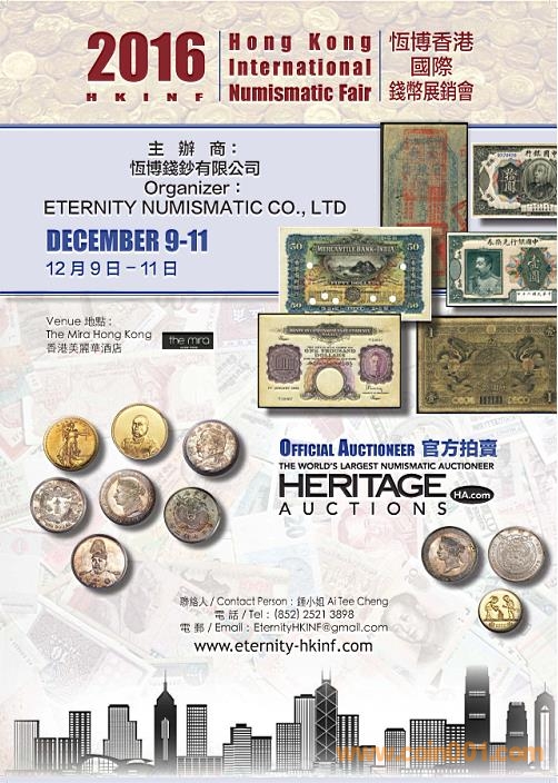 第三屆「恒博香港國際錢幣展銷會」同時也配合官方拍賣公司--海瑞得拍賣行Heritage Auctions(簡稱HA)于12月7及8日的拍賣會。即將的12月香港拍賣亮點包括:民國三年 (1914) 袁世凱像一圓 L. Giorgi 簽字版樣幣SP63 PCGS, 1993年孔雀1500 元精製金幣(20 盎司)。 PR68 Ultra Cameo NGC, 紙幣名譽品「內蒙古駱駝隊」一萬圓等。