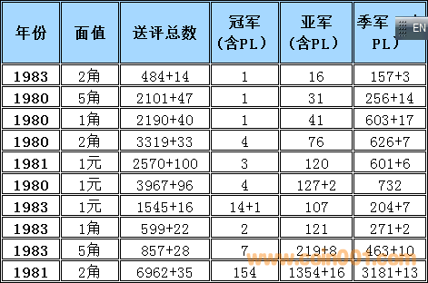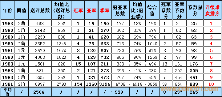 普制長(zhǎng)城幣評(píng)級(jí)難度排序2016-11(全新改版) 普制長(zhǎng)城幣評(píng)級(jí)難度排序與早期分幣難度排序有明顯的區(qū)別,為了能體現(xiàn)難度系數(shù)的準(zhǔn)確性和科學(xué)性在計(jì)算時(shí)考慮的因素相對(duì)要復(fù)雜一些,主要參考了評(píng)級(jí)的總數(shù),均值比(送評(píng)總數(shù)),冠亞季軍總數(shù),均值比(冠亞季總數(shù))等數(shù)據(jù)作為計(jì)算的主要依據(jù),同時(shí)各個(gè)均值段的補(bǔ)償方法也比較復(fù)雜 首先我們需要討論評(píng)級(jí)幣的價(jià)格構(gòu)成評(píng)級(jí)幣的價(jià)格構(gòu)成 裸幣的價(jià)格+評(píng)級(jí)溢價(jià)+評(píng)級(jí)費(fèi)用=評(píng)級(jí)幣的參考價(jià)格 主要可以參考以下2個(gè)因數(shù), 第一個(gè)因素為裸幣本生的價(jià)格(它的價(jià)格變動(dòng)主要依據(jù)裸幣成交價(jià)格的變動(dòng)而變動(dòng)與評(píng)級(jí)溢價(jià)之間的關(guān)系不大) 舉例來說: 裸幣的價(jià)格上漲1倍評(píng)級(jí)難度系數(shù)沒有變化的話,評(píng)級(jí)幣的價(jià)格應(yīng)該相應(yīng)的上漲1倍+溢價(jià)+評(píng)級(jí)費(fèi)用=評(píng)級(jí)幣的參考價(jià)格,裸幣的價(jià)格的上漲只能帶動(dòng)評(píng)級(jí)幣裸幣部分的上升,裸幣價(jià)格下跌,評(píng)級(jí)難度系數(shù)沒有變化的話,評(píng)級(jí)幣的價(jià)格為裸幣下跌的價(jià)格+溢價(jià)+評(píng)級(jí)費(fèi)用=評(píng)級(jí)幣的參考價(jià)格,裸幣的價(jià)格的下跌只能帶動(dòng)評(píng)級(jí)幣裸幣部分的下跌 第二個(gè)因素為評(píng)級(jí)難度所產(chǎn)生的一個(gè)溢價(jià)難度系數(shù)越高它對(duì)應(yīng)的溢價(jià)就越高。溢價(jià)變化主要依據(jù)評(píng)級(jí)難度系數(shù)與系數(shù)平均值的變化和對(duì)比來決定,溢價(jià)水平的上升在一定的程度上會(huì)提升高品質(zhì)裸幣的價(jià)格(卷光卷拆的硬幣)和品相的稀缺性,裸幣價(jià)格的下跌,如果評(píng)級(jí)難度提高的話評(píng)級(jí)幣的價(jià)格反而有可能會(huì)上升,從以上的結(jié)果可以得出下列結(jié)論,溢價(jià)是評(píng)級(jí)價(jià)格體系當(dāng)中最重要的組成部分,溢價(jià)和裸幣的價(jià)格體系完全是獨(dú)立的,之間的價(jià)格沒有直接的聯(lián)系 備注:關(guān)于這個(gè)數(shù)據(jù)的準(zhǔn)確性在設(shè)計(jì)這個(gè)表的時(shí)候我已經(jīng)考慮到了一個(gè)重評(píng)的可能性所以我只取冠,亞,季軍作為一個(gè)參考并同時(shí)設(shè)計(jì)了一個(gè)補(bǔ)償方案,重評(píng)從時(shí)間和金錢的角度來衡量的話不是非常經(jīng)濟(jì)且還存在一定的風(fēng)險(xiǎn),但是從長(zhǎng)遠(yuǎn)看不能排除這個(gè)因數(shù)。雖然將來會(huì)產(chǎn)生一些誤差,但我認(rèn)為誤差不會(huì)太大尤其在高分段和稀缺性的錢幣,對(duì)于普制長(zhǎng)城幣來說NGC已經(jīng)作為收藏的主流其數(shù)據(jù)的準(zhǔn)確性還是比較值得信賴的。 采樣的范圍取樣范圍:1980-1985普制長(zhǎng)城幣難度排序的選擇標(biāo)準(zhǔn):送評(píng)總數(shù)的平均值高于100%的普制長(zhǎng)城幣,低于100%的數(shù)據(jù)將不體現(xiàn)在難度排序中 計(jì)算公式: 評(píng)級(jí)總數(shù)/均值=均值比考慮到1983年長(zhǎng)城幣存世量明顯低于其他年份的普制長(zhǎng)城幣,1983年的數(shù)據(jù)將保留和計(jì)入到難度排序中,大家可以通過下面的圖表黃色部分發(fā)現(xiàn)被刪除的年份主要是送評(píng)溢價(jià)不高的年份,如果未來送評(píng)量穩(wěn)步上升的話,它將加入到采樣的范圍.備:這個(gè)采樣的范圍會(huì)有一定的誤差,我將根據(jù)均值比的變化每個(gè)季度第一周進(jìn)行適當(dāng)?shù)恼{(diào)整,由于普制長(zhǎng)城幣的版別比較復(fù)雜,無法進(jìn)行細(xì)分這里主要以年份為主,請(qǐng)大家諒解! 采樣的數(shù)據(jù)和計(jì)算的依據(jù)統(tǒng)計(jì)第一檔次每個(gè)年份冠,亞,季的出分?jǐn)?shù)量作為一個(gè)分析依據(jù),為了能更加的量化我用數(shù)字的方法進(jìn)行統(tǒng)計(jì),方法如下:調(diào)整后的均值比 普制長(zhǎng)城幣的計(jì)算方法如下:綜合值的計(jì)算方法:(送評(píng)總數(shù)均值比+冠亞季總數(shù)均值比)÷2=綜合值具體計(jì)算方法如下:均值比在0-50%冠軍分1枚為1分2枚2分以此類推,亞軍分1枚為2分2枚4分以此類推,季軍1枚為3分2枚6分以此類推補(bǔ)償方法如下:如果冠軍分的評(píng)分?jǐn)?shù)量大于總數(shù)(冠,亞,季之和)的15%,冠軍分的1枚為1.5分,如果冠軍分的評(píng)分?jǐn)?shù)量大于總數(shù)(冠,亞,季之和)的50%冠軍分的1枚為2分如果亞軍分的評(píng)分?jǐn)?shù)量大于總數(shù)(冠,亞,季之和)的35%,亞軍分的1枚為2.5分,如果亞軍分的評(píng)分?jǐn)?shù)量低于總數(shù)(冠,亞,季之和)的25%亞軍分的1枚為1.5分 均值比在50-100%冠軍分1枚為1分2枚2分以此類推,亞軍分1枚為1.5分2枚3分以此類推,季軍1枚為2分2枚4分以此類推此范圍+值補(bǔ)償如果冠軍分的評(píng)分?jǐn)?shù)量大于總數(shù)(冠,亞,季之和)的50%冠軍分的1枚為1.25分如果亞軍分的評(píng)分?jǐn)?shù)量大于總數(shù)(冠,亞,季之和)的35%,亞軍分的1枚為1.75分 均值比在100-150%冠軍分1枚為0.5分2枚1分以此類推,亞軍分1枚為1分2枚2分以此類推,季
