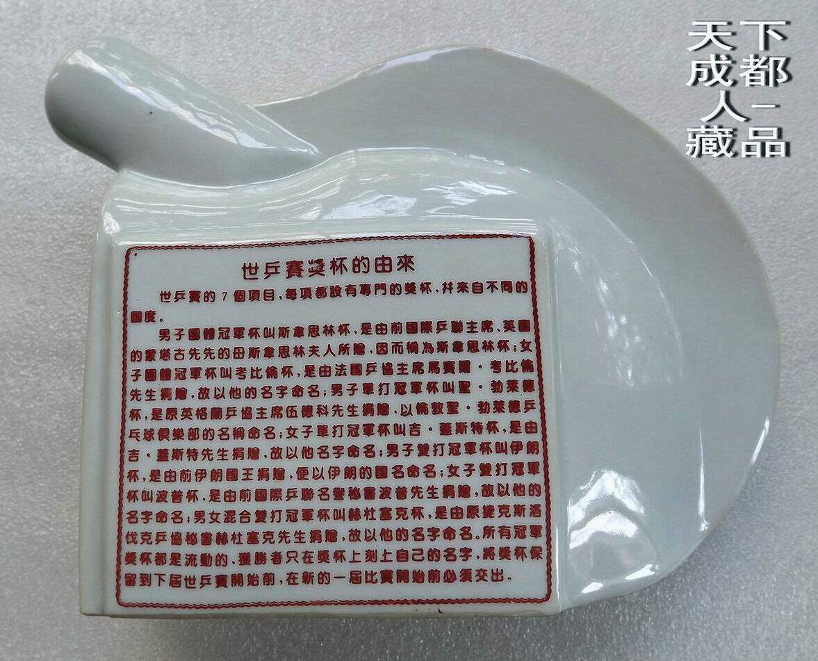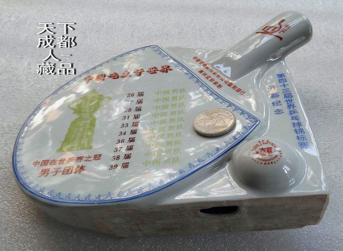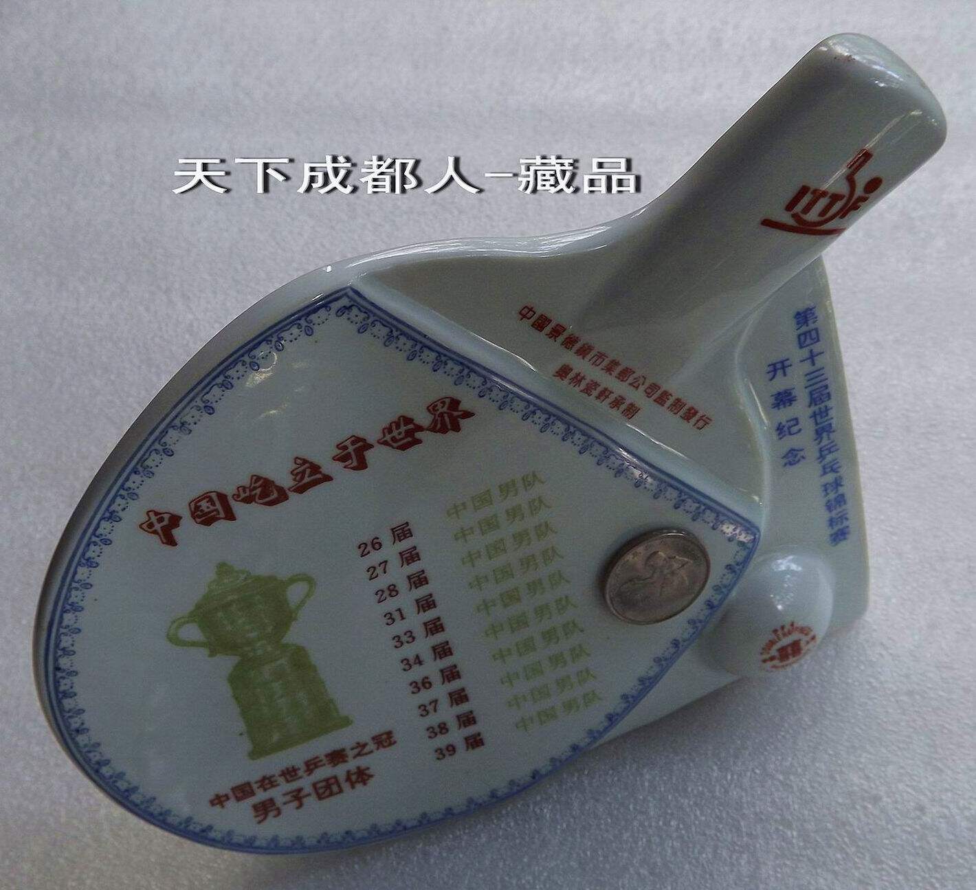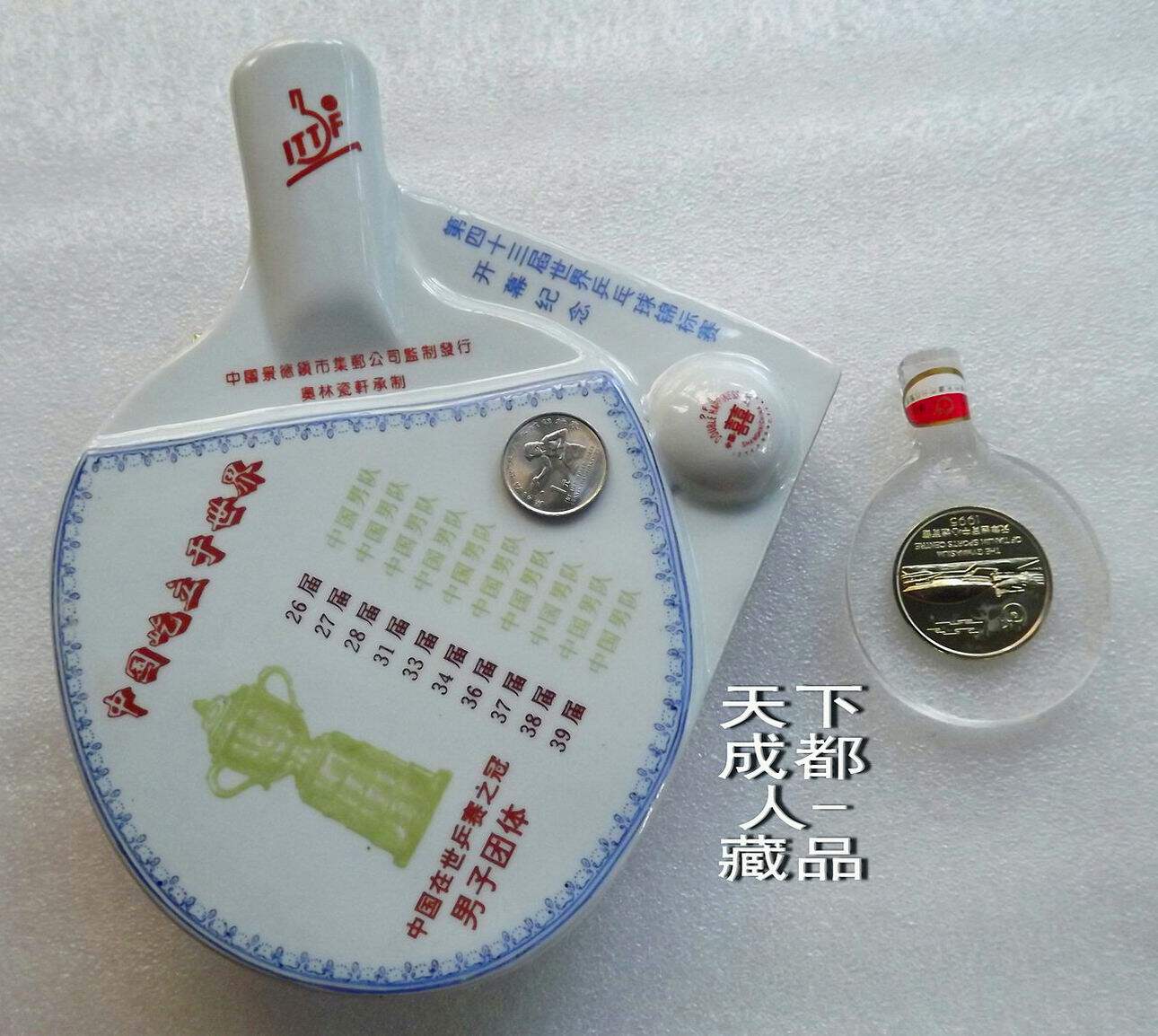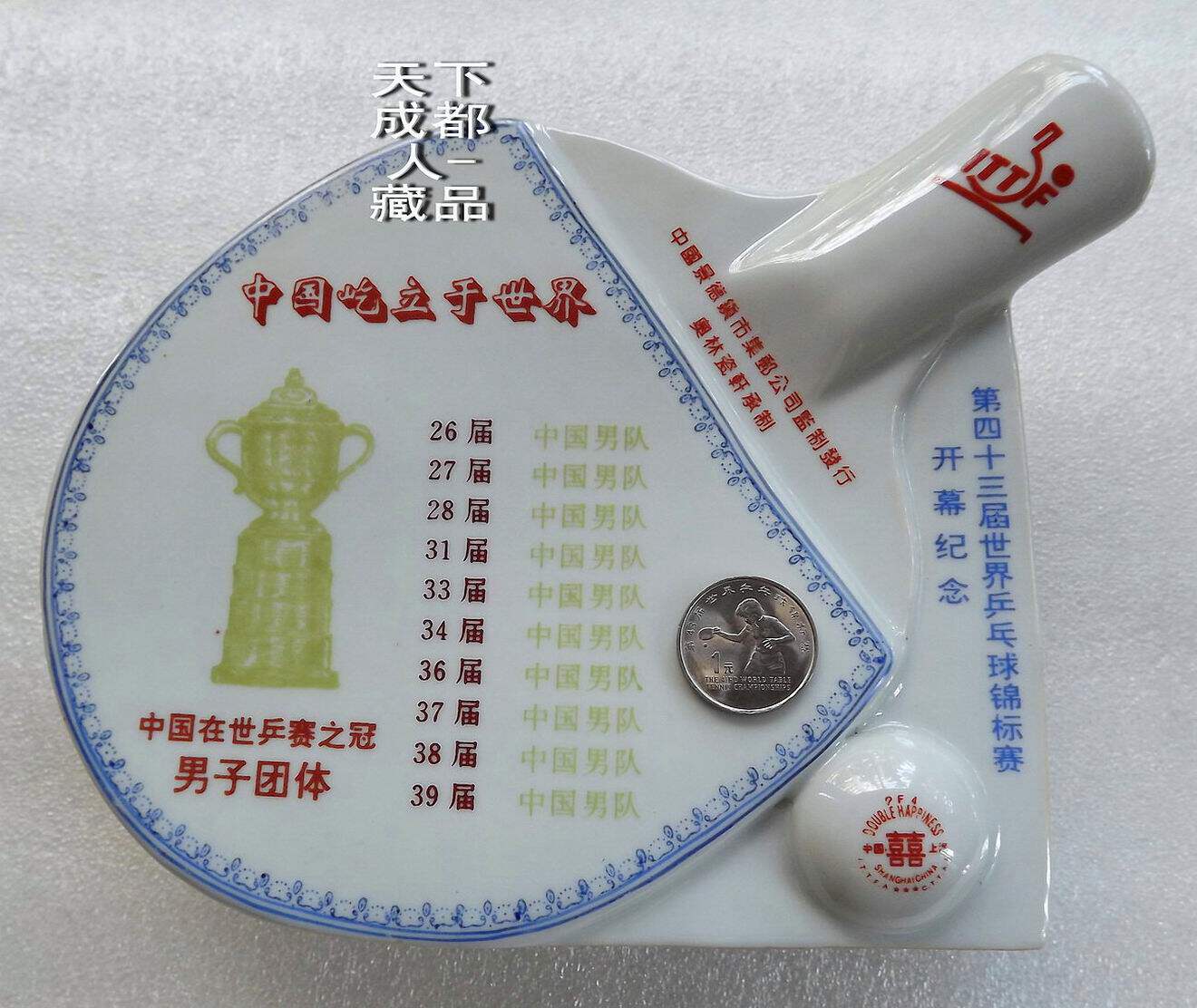 1995年10月為紀念第43屆世界乒乓球錦標賽開幕紀念,由中國景德鎮市集郵公司監制、奧林瓷軒承制發行《第43屆世界乒乓球錦標賽陶瓷球拍擺件鑲嵌幣》原陶瓷擺件1個;該陶瓷球拍選自江西景德鎮優質原料“高嶺土”精心仿制實物乒乓球拍大小尺寸制作(球拍長22.5厘米、高7.5厘米、厚4.5厘米),正面鑲嵌43屆世乒賽紀念幣(面值壹元、材質鋼芯鍍鎳、直徑25毫米)1枚。
