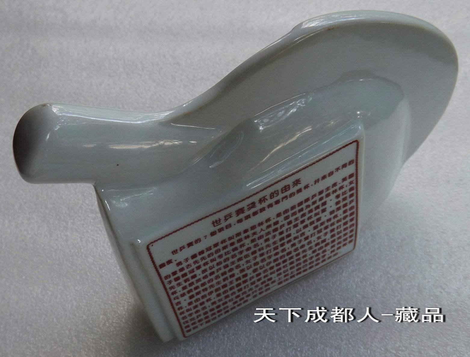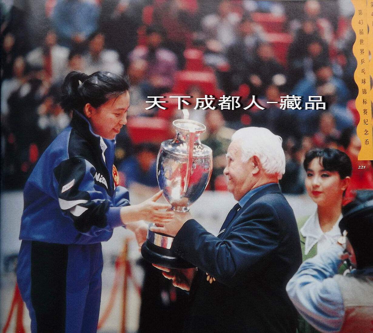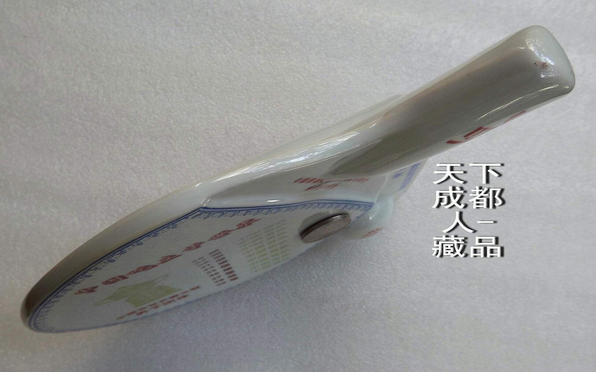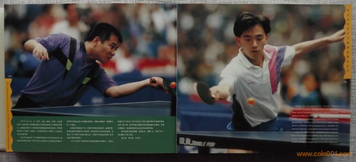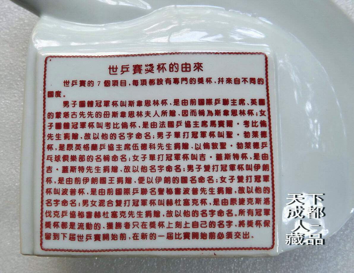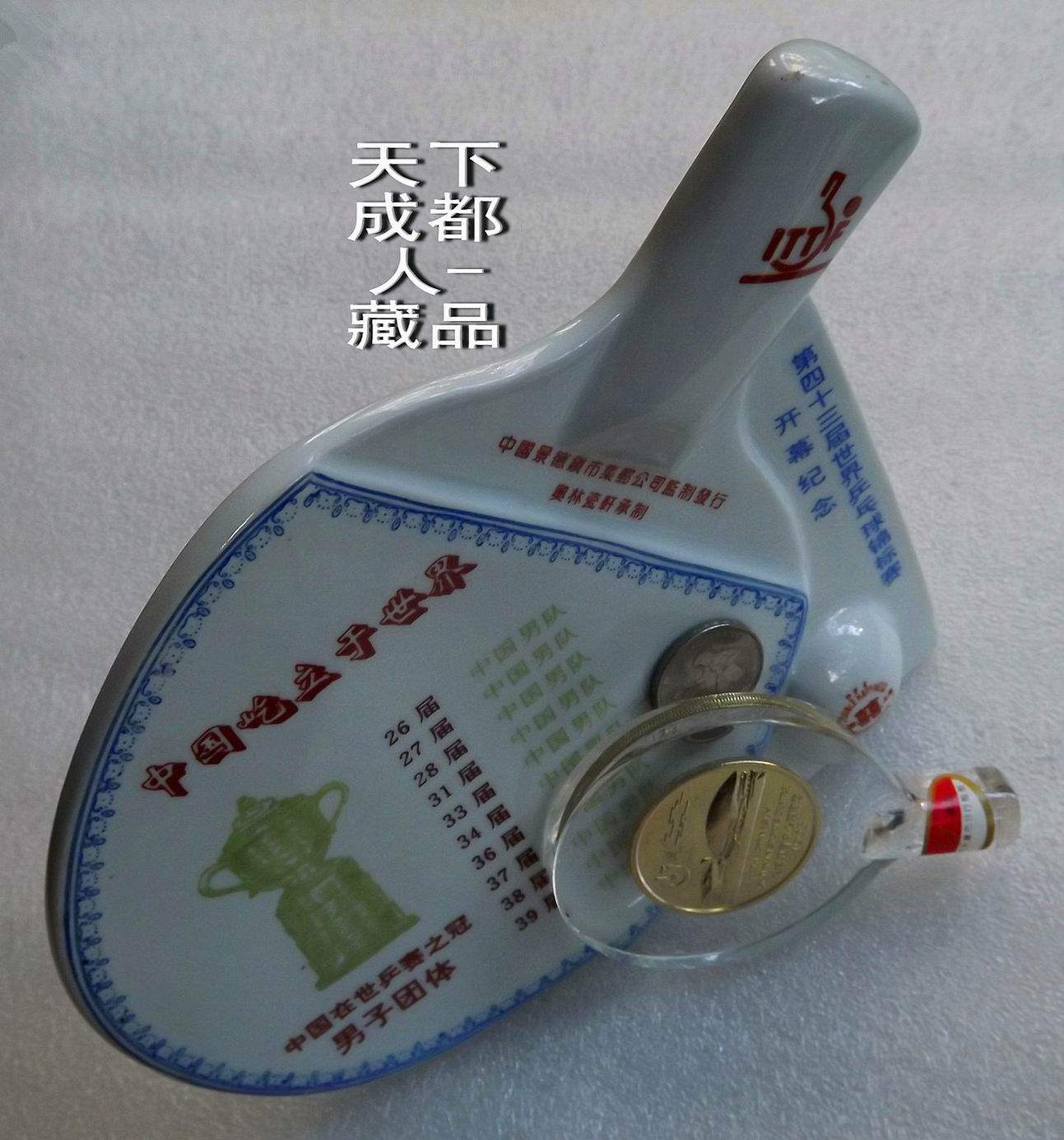1995年10月為紀念第43屆世界乒乓球錦標賽開幕紀念,由中國景德鎮市集郵公司監制、奧林瓷軒承制發行《第43屆世界乒乓球錦標賽陶瓷球拍擺件鑲嵌幣》原陶瓷擺件1個;該陶瓷球拍選自江西景德鎮優質原料“高嶺土”精心仿制實物乒乓球拍大小尺寸制作(球拍長22.5厘米、高7.5厘米、厚4.5厘米),正面鑲嵌43屆世乒賽紀念幣(面值壹元、材質鋼芯鍍鎳、直徑25毫米)1枚。