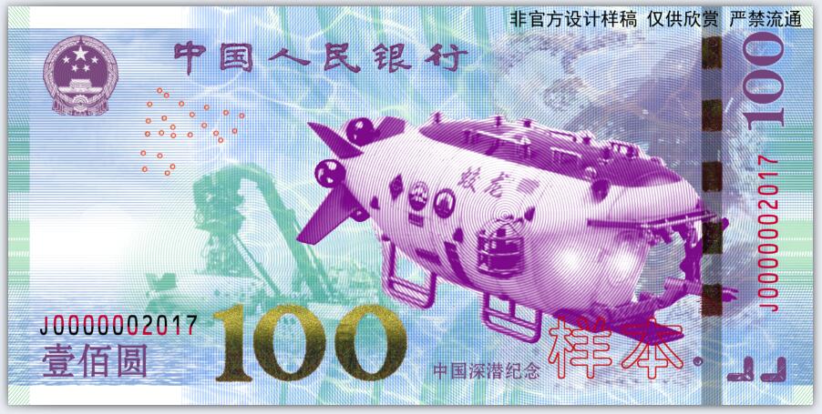 上能九天攬月,下能入海捉鱉。近日央媽公布了2017年紀念鈔幣的發行計劃,其中就包括了一張“中國深潛紀念鈔”,不過央媽并非公布票樣圖片,值此之際,先搶先PS一張供大家欣賞。非官方設計稿,僅供欣賞,不得作他用!