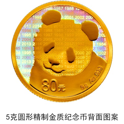 5克圓形金質紀念幣為精制幣,含純金5克,直徑20毫米,面額80元,成色99.9%,最大發行量50000枚。