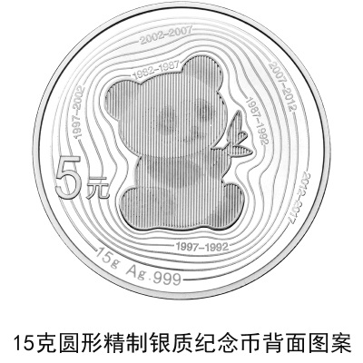 15克圓形銀質紀念幣背面圖案為卡通大熊貓剪影圖形,襯以年輪線條及年份數字組合設計,并刊“15g Ag .999”字樣及面額。