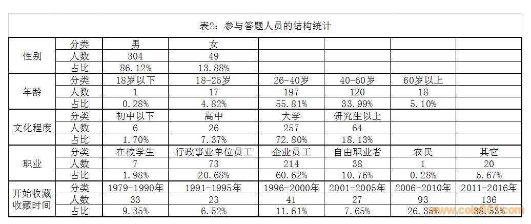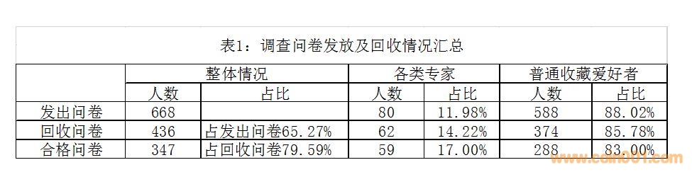 (3)在回收的436份問卷,合格答卷347份,占回收問卷的70.59%。其中各類專家59人,占17.00%;普通收藏愛好者288人,占83.00%。(備注:合格答卷為全部完成標準問卷的答卷)