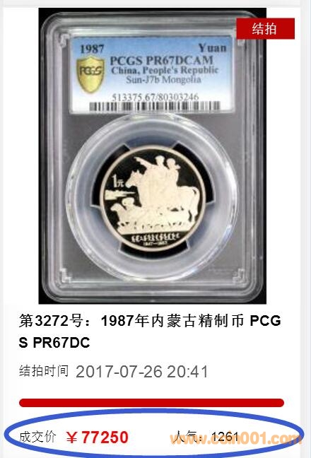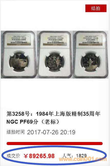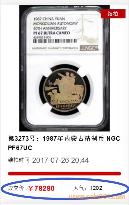 2.早期精制幣價格堅挺, 第3258號:1984年上海版精制35周年 NGC PF69分(老標) 89,266元成交;第3272號:精制內蒙古PCGS PR67DC 77,250元成交; 第3273號:精制內蒙古NGC PF67UC 78,280元成交;第3282號:1991年植樹節精制幣 NGC PF69UC 47,381成交,創該項拍品價格新高.