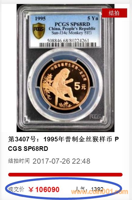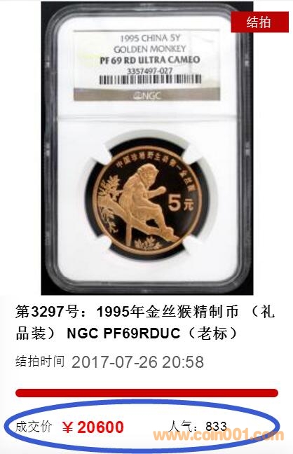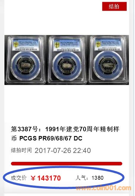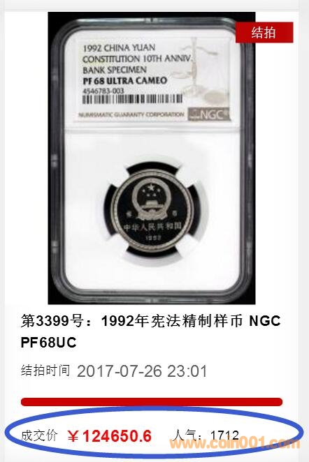 2017現代錢幣網夏季大拍經過2天的激烈爭奪,昨晚順利結束。本次夏拍共418項拍品,總成交金額3,822,940元,總成交率92.6%。 昨晚拍賣總計209項拍品,其中貴金屬幣24項,紀念章4項,紀念幣126項,樣幣54項??傆嫵山唤痤~1,991,558元,成交率96%。昨晚多項拍品成交價格打破拍賣紀錄,繼續引領現代流通硬幣的行情。 本場拍賣亮點如下:1.高端樣幣屢破記錄,第3387號:PCGS評級的建黨精制樣幣143,170元成交,成為昨晚的“標王”;第3399號:憲法精制樣幣NGC PF68UC,成交價格124,650元, 第3407號:金絲猴樣幣 PCGS SP68RD經過81次競價,最終106,090元,其中憲法精制樣幣首次公開拍賣,其成交價格極具市場指導意義。
