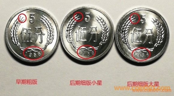 1956年5分(小星粗字)是最近1年新發(fā)現(xiàn)的品種,和我們之前常見的565(大星/小星細(xì)字)有明顯的區(qū)別,目前中國早期流通硬幣的研究方興未艾,隨著1956年5分(小星粗字)的發(fā)現(xiàn),我相信會有更多的錢幣愛好者參與中國早期流通硬幣的微觀研究。1956年5分(小星粗字)由于焦點(diǎn)區(qū)域都有統(tǒng)一的鑄痕,目前最高分MS67,評級難度極高。