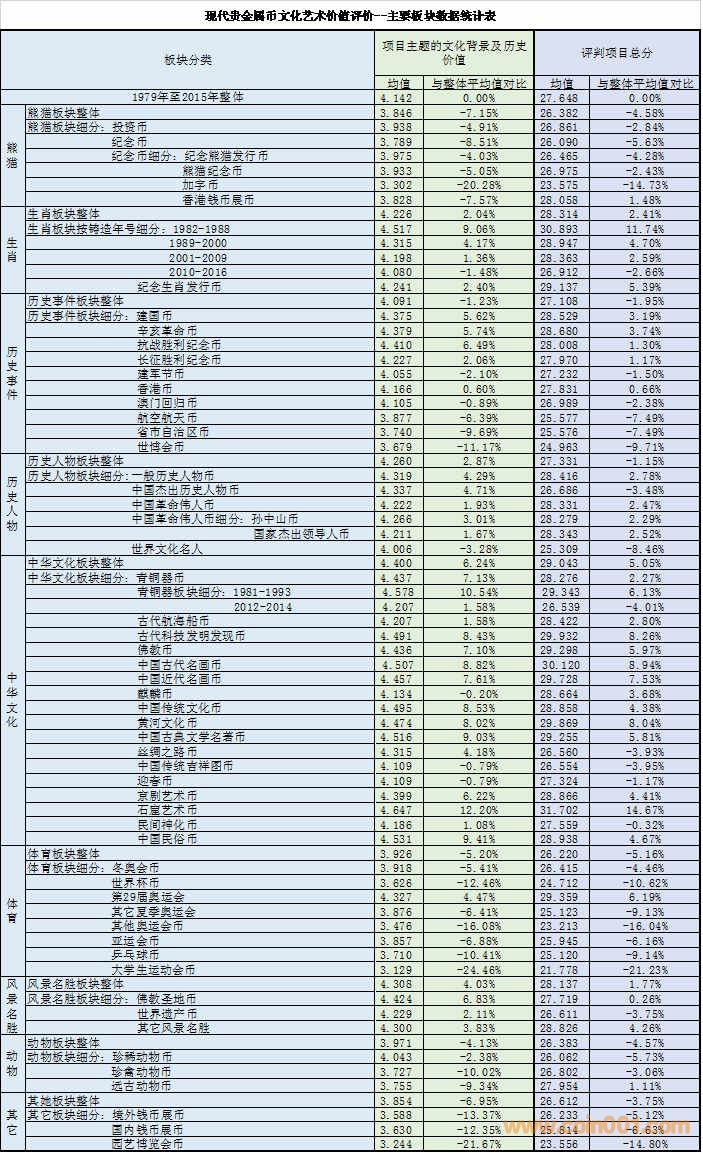??????我國現代貴金屬幣內部主要板塊文化藝術價值的評價情況見下表: