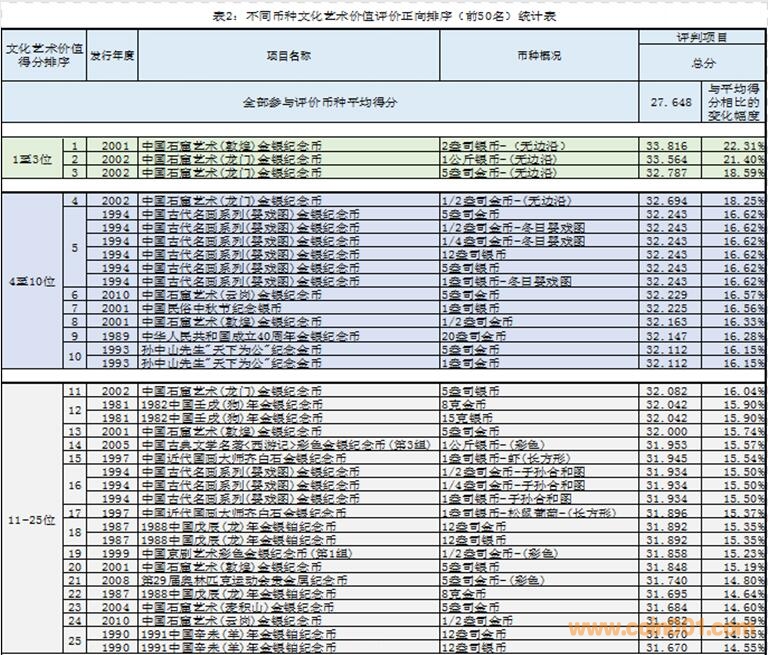 (7)文化藝術價值7項評價指標的總分合計在“5~35”分范圍內。在得分前50名的排序中,“2001年中國石窟藝術(敦煌)金銀紀念幣”中的2盎司銀幣排在首位,得分33.816。