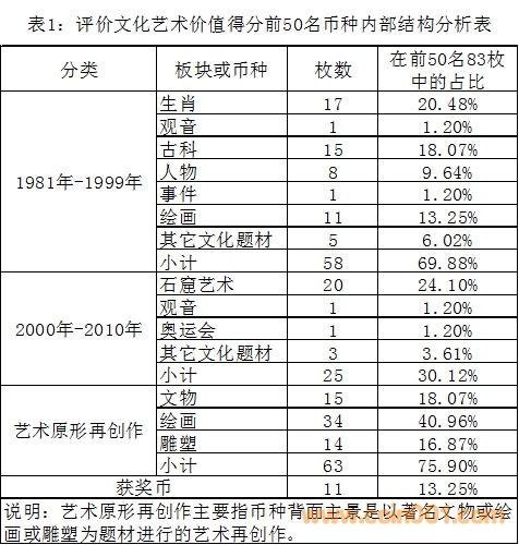 我國現代貴金屬幣文化藝術價值得分前50名的幣種統計分別見表2。