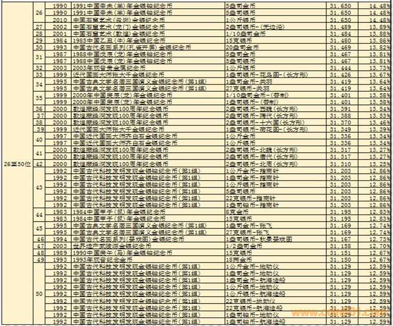 第四期數據主要是在這次問卷調查活動中,被訪者評價我國現代貴金屬幣文化藝術價值得分前50名的幣種統計。