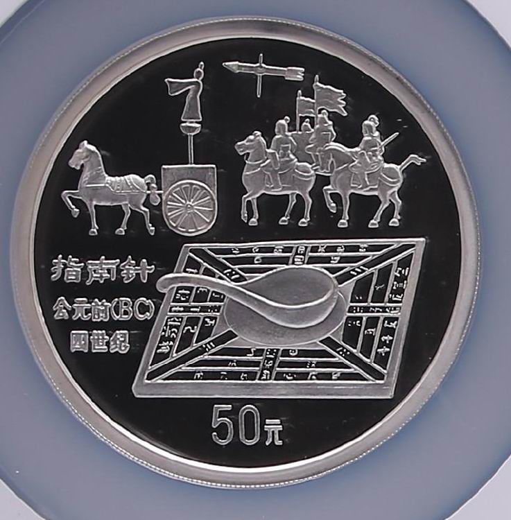 那么在其余的銀幣當中還有沒有能夠評上五星級而被低估的呢?比如12盎司銀鄭成功,或者公斤銀齊白石,相信大家都有心目中的答案。而我今天要說的這枚銀幣是一枚隱藏的大珍,市場難覓芳容,星級榜也未見其蹤影。它就是:指南針5盎司銀幣山字版。