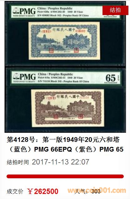????二、紙幣部分也有多項亮點。第4128號:第一版1949年20元六和塔(藍色)PMG 66EPQ(紫色)PMG 65E,本項拍品均為PMG冠軍分,其中藍色六和塔是唯一冠軍分,最終以