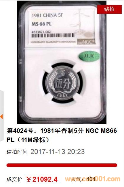 ????本場次還有一大亮點,就是經過11M再評級的錢幣受到追捧,例如第4024號:1981年普制5分 NGC MS66PL(11M綠標),以