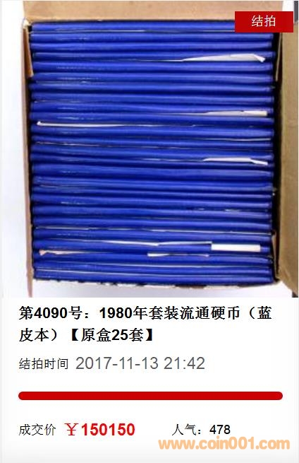264600元的價格成交;第4090號拍品:1980年套裝流通硬幣(藍皮本)【原盒25套】,以