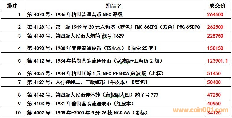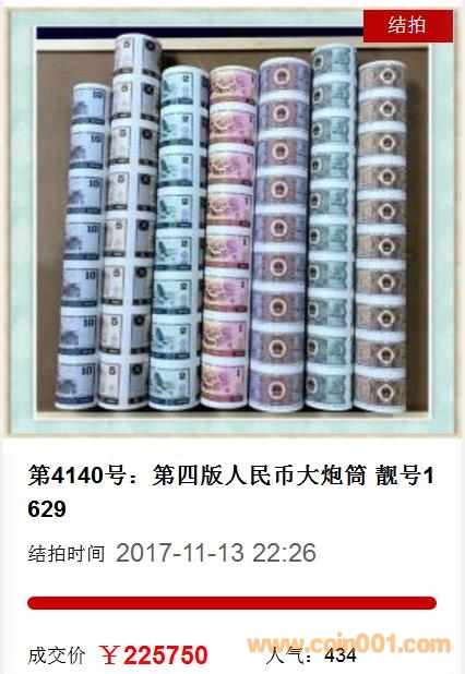 262500元的價格成交;第4140號:第四版人民幣大炮筒,靚號1629,最終成交價格