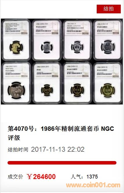 3622元成交,讓人眼前一亮;第4070號拍品:1986年精制流通套幣 NGC評級,雖然評級分數整體比夏拍那套低一些,但是仍為本場最大亮點,但在經過53次競價之后,最終以