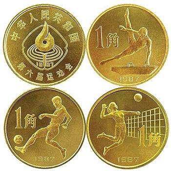(二)銅鋅合金(1987)。此材質至今只發行了1套3枚普通流通紀念幣,即“中華人民共和國第六屆全國運動會”紀念幣;這套紀念幣材質唯一、面值唯一(一角面值)、個頭最小之一,有收藏價值,就是保管不易,極容易氧化變色。在早期普通流通紀念幣中發行量偏大,想要絕品不太容易。