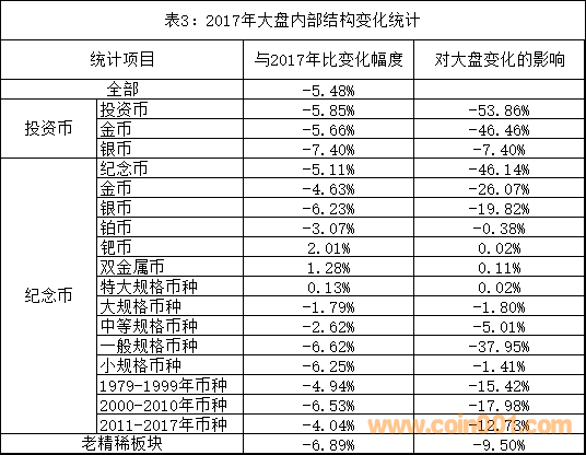 如表3所示,2018年中期與2017年相比,在2017年大盤內(nèi)部投資幣的總市值下降5.85%,紀(jì)念幣總市值下降5.11%,投資幣的下降幅度略大于紀(jì)念幣。在投資幣內(nèi)部,投資金幣市值下降5.66%,投資銀幣市值下降7.40%。在帶動(dòng)大盤下行的權(quán)重中,投資幣占53.86%,紀(jì)念幣占46.14%。