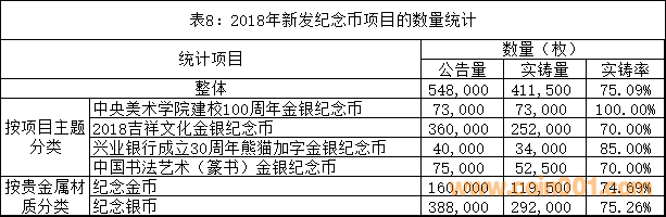 2018年新發(fā)紀(jì)念幣項(xiàng)目的品種和數(shù)量統(tǒng)計(jì)見(jiàn)表8。