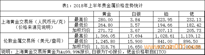 如表1所示,2018年上半年國(guó)內(nèi)金、銀、鉑、鈀等貴金屬的加權(quán)平均交易價(jià)格普遍處于下行狀態(tài),與2017年加權(quán)平均交易價(jià)格相比,黃金下降1.38%,白銀下降6.52%,鉑金下降6.28%,鈀金下降4.60%。