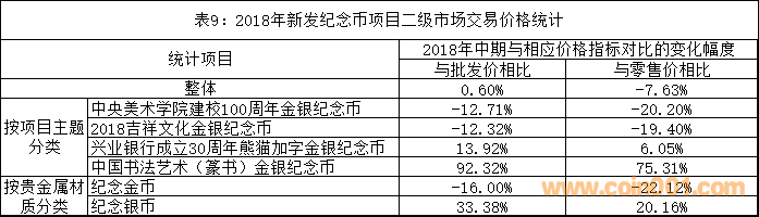 2018年新發(fā)紀(jì)念幣項(xiàng)目的價(jià)格數(shù)據(jù)見(jiàn)表9。
