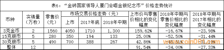 在價(jià)格下跌的幣種中,2017年發(fā)行的特定題材紀(jì)念幣板塊整體下跌10.08%,其中的“金磚國(guó)家領(lǐng)導(dǎo)人廈門會(huì)晤金銀紀(jì)念幣”具有典型代表性。這個(gè)項(xiàng)目的價(jià)格走勢(shì)統(tǒng)計(jì)見(jiàn)表6。