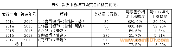 在價(jià)格上漲的幣種中,比較典型的是2014年至2017年發(fā)行的賀歲幣(民間也稱為福字幣)。這個(gè)系列幣種的交易價(jià)格變化統(tǒng)計(jì)見(jiàn)表5。