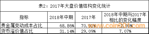 我國(guó)貴金屬幣的價(jià)值結(jié)構(gòu)由貴金屬價(jià)值和貨幣溢價(jià)因素提供的價(jià)值(簡(jiǎn)稱貨幣溢價(jià)值)共同構(gòu)成。2017年大盤的價(jià)值結(jié)構(gòu)變化統(tǒng)計(jì)見(jiàn)表2。